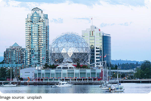Vancouver is in the southwest corner of British Columbia, right by the Pacific Ocean. It’s only 250 km (about 155 miles) north of Seattle, and we can reach it by: