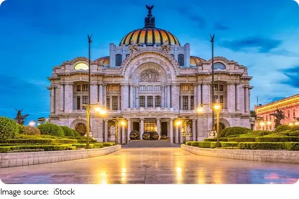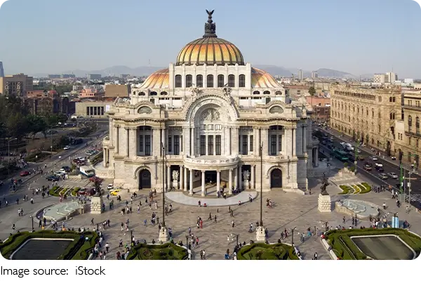 Often called “Mexico’s art cathedral,” it’s located in the historic center, just west of Alameda Central Park, making it an essential stop for travelers. From the moment we see its marble exterior and copper dome, we know this is a landmark worth visiting.