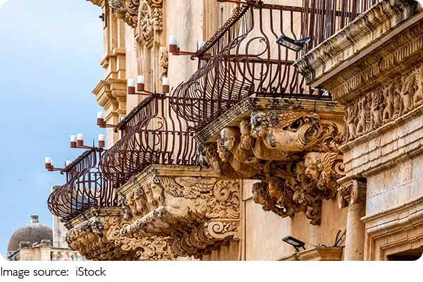 When we travel to Sicily, Nicolaci Palace in Noto is always at the top of our list. This 18th-century palace is a true Baroque masterpiece, famous for its grand balconies adorned with intricate sculptures.